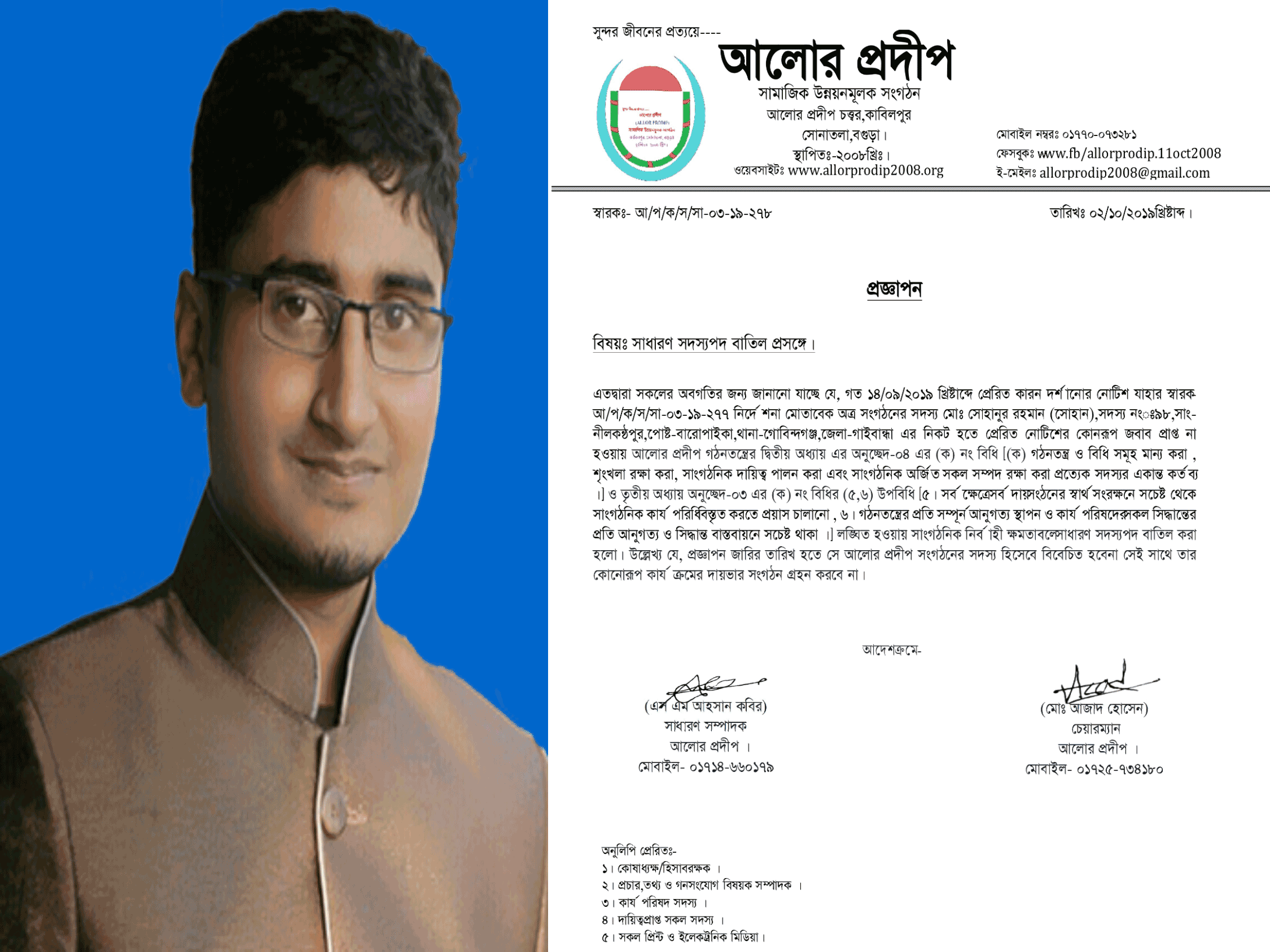 এতদ্বারা সকলের অবগতির জন্য জানানো যাচ্ছে যে, গত ১৪/০৯/২০১৯ খ্রিষ্টাব্দে প্রেরিত কারন দর্শানোর নোটিশ যাহার স্বারক- আ/প/ক/স/সা-০৩-১৯-২৭৭ নির্দেশনা মোতাবেক অত্র সংগঠনের সদস্য মোঃ সোহানুর রহমান (সোহান),সদস্য নংঃ-৯৮,সাং-নীলকন্ঠপুর,পোষ্ট-বারোপাইকা,থানা-গোবিন্দগঞ্জ,জেলা-গাইবান্ধা এর নিকট হতে প্রেরিত নোটিশের কোনরূপ জবাব প্রাপ্ত না হওয়ায় আলোর প্রদীপ গঠনতন্ত্রের দ্বিতীয় অধ্যায় এর অনুচ্ছেদ-০৪ এর (ক) নং বিধি [(ক) গঠনতন্ত্র ও বিধি সমূহ মান্য করা , শৃংখলা রক্ষা করা, সাংগঠনিক দায়িত্ব পালন করা এবং সাংগঠনিক অর্জিত সকল সম্পদ রক্ষা করা প্রত্যেক সদস্যর একান্ত কর্তব্য ।] ও তৃতীয় অধ্যায় অনুচ্ছেদ-০৩ এর (ক) নং বিধির (৫,৬) উপবিধি [৫। সর্বক্ষেত্রে সর্বদায় সংঠনের স্বার্থ সংরক্ষনে সচেষ্ট থেকে সাংগঠনিক কার্যপরিধি বিস্তৃত করতে প্রয়াস চালানো , ৬। গঠনতন্ত্রের প্রতি সম্পূর্ন আনুগত্য স্থাপন ও কার্যপরিষদের সকল সিদ্ধান্তের প্রতি আনুগত্য ও সিদ্ধান্ত বাস্তবায়নে সচেষ্ট থাকা ।] লঙ্ঘিত হওয়ায় সাংগঠনিক নির্বাহী ক্ষমতাবলে সাধারণ সদস্যপদ বাতিল করা হলো। উল্লেখ্য যে, প্রজ্ঞাপন জারির তারিখ হতে সে আলোর প্রদীপ সংগঠনের সদস্য হিসেবে বিবেচিত হবেনা সেই সাথে তার কোনোরূপ কার্যক্রমের দায়ভার সংগঠন গ্রহন করবে না।